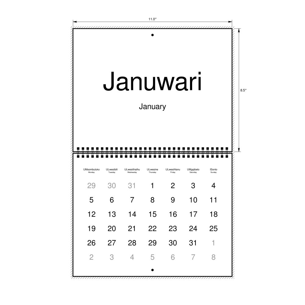 A Zulu-language wall calendar (2026, Monday-start format) with English translations.