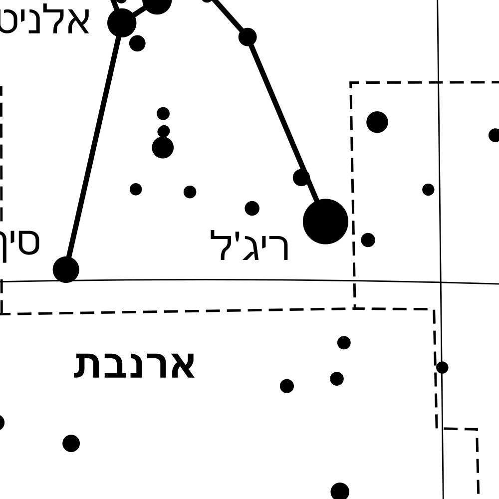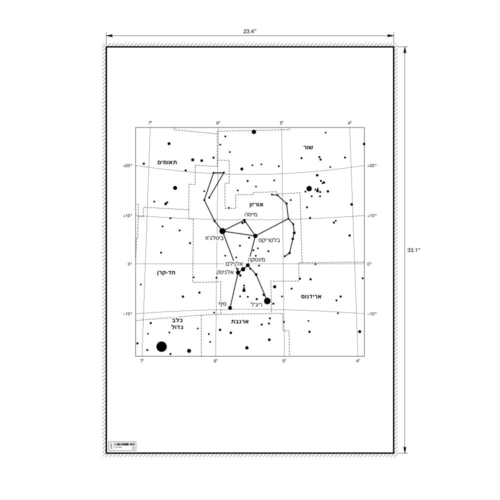 A poster featuring the Orion constellation chart in Hebrew (אוריון).