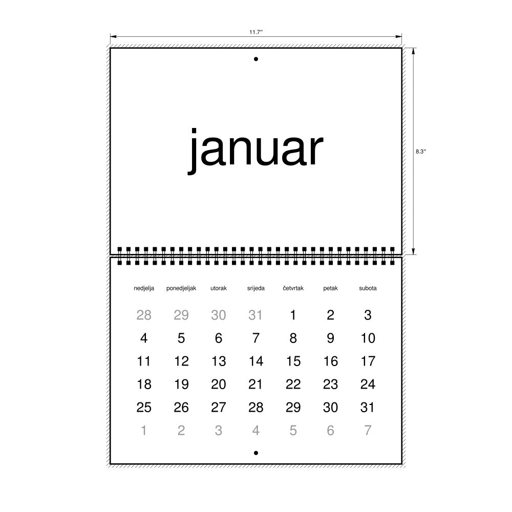 This calendar features the Montenegrin names of months and days of the week on top of a standard Gregorian calendar layout. Beyond its utility for tracking dates, it serves as an educational tool, cultural touchstone (cultural artifact), and functional decor (aesthetic object).