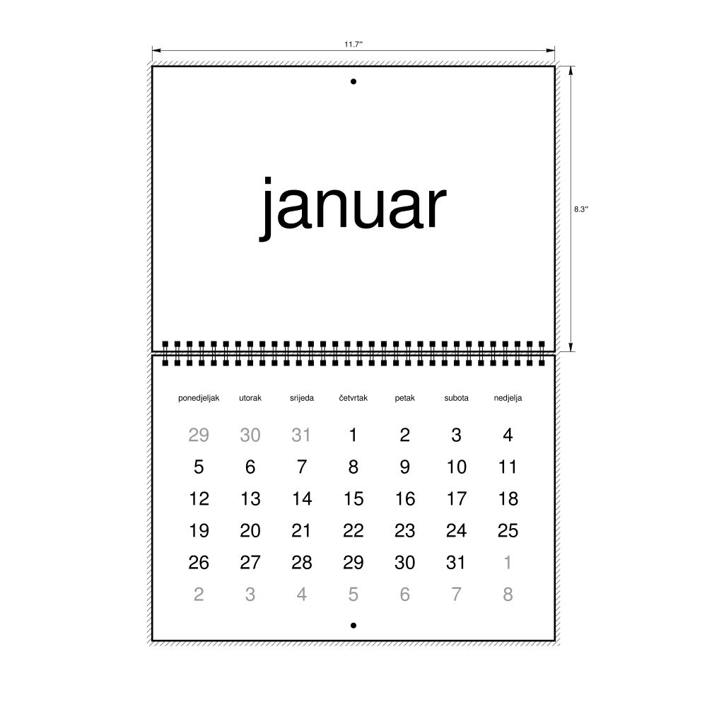 2026 Wall Calendar, Montenegrin-Labeled, Monday-Start Layout, Wire-Bound, 11.7 x 8.3 in (29.7 x 21.0 cm)