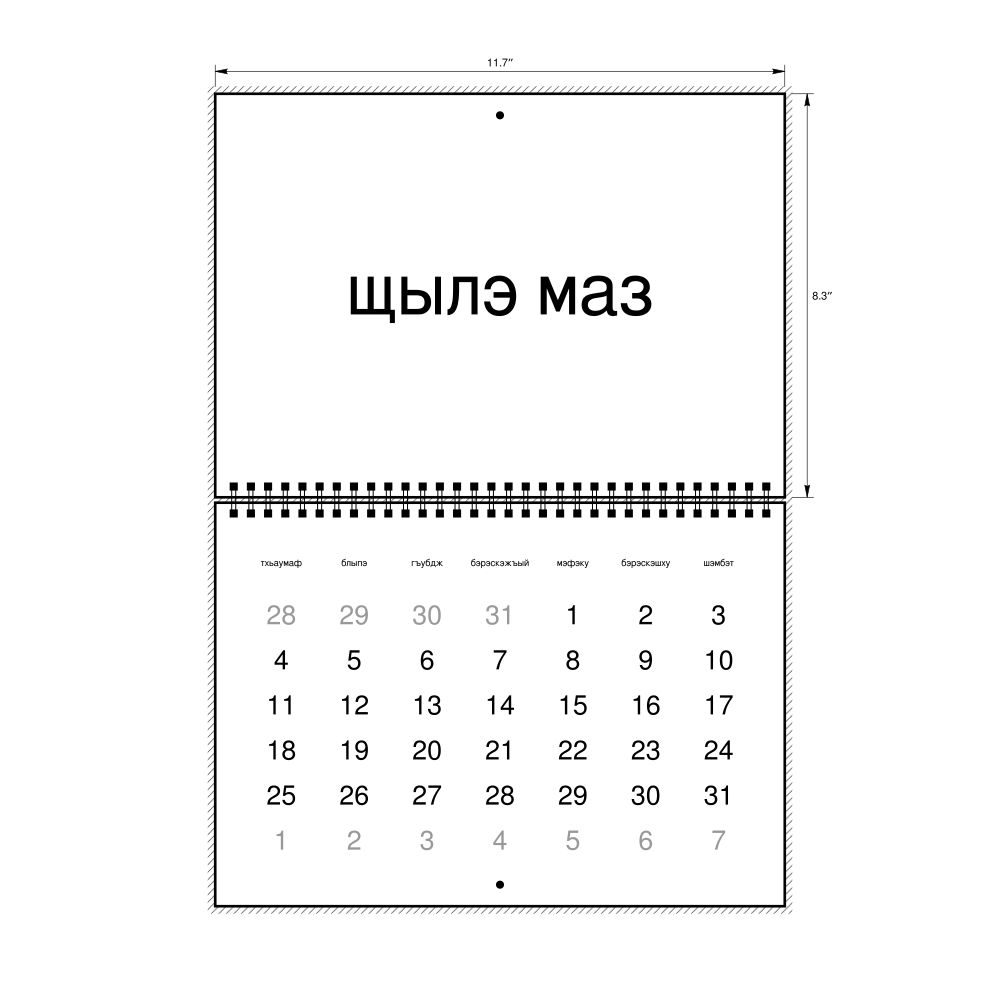 This calendar features the Adyghe names of months and days of the week on top of a standard Gregorian calendar layout. Beyond its utility for tracking dates, it serves as an educational tool, cultural touchstone (cultural artifact), and functional decor (aesthetic object).