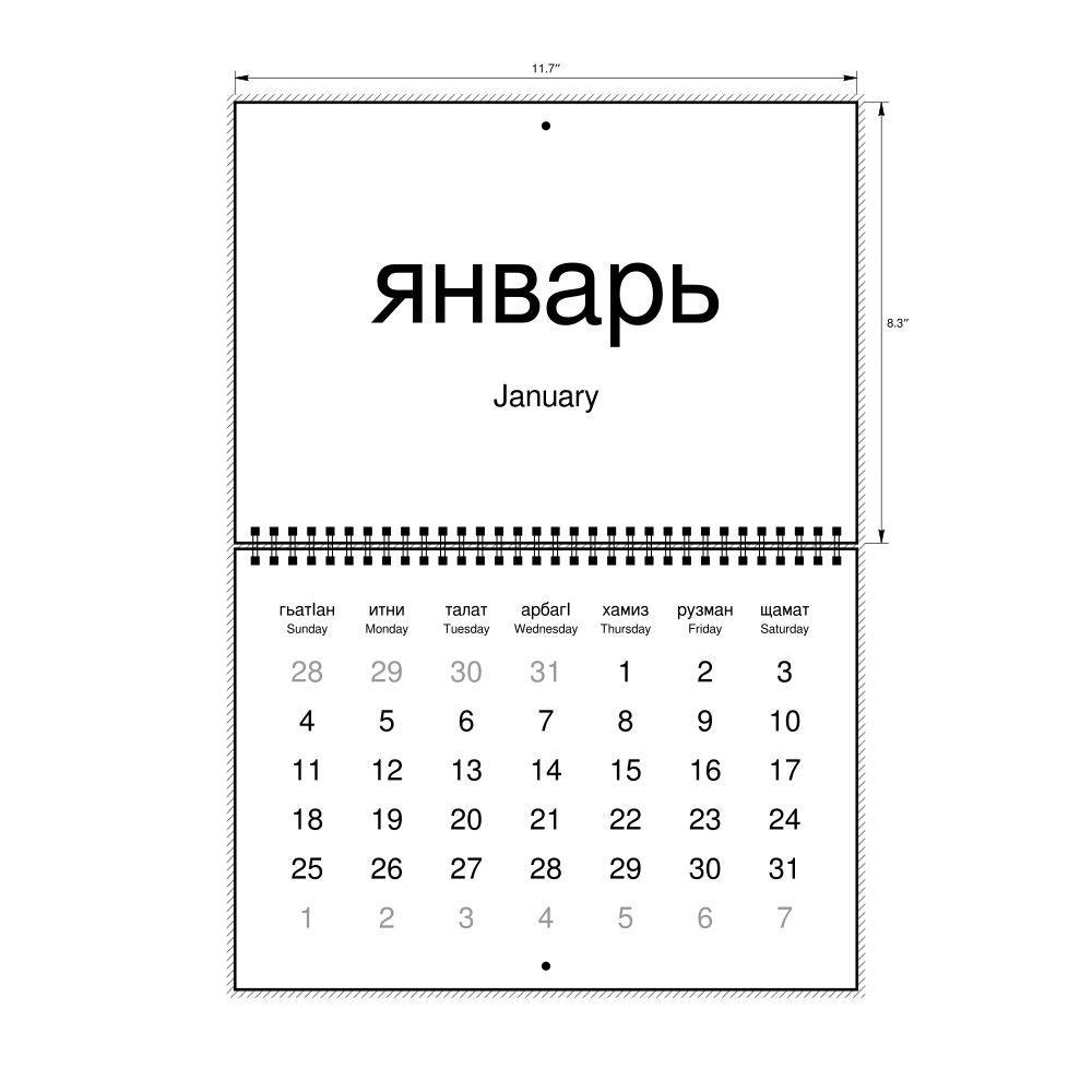 An Avar-language wall calendar (2026, Sunday-start format) with English translations.