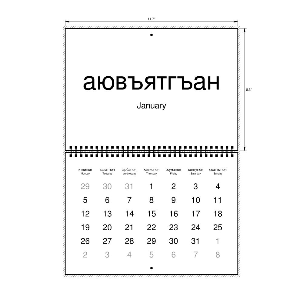 2027 Wall Calendar, Kumyk/English-Labeled, Monday-Start Layout, Wire-Bound, 11.7 x 8.3 in (29.7 x 21.0 cm)