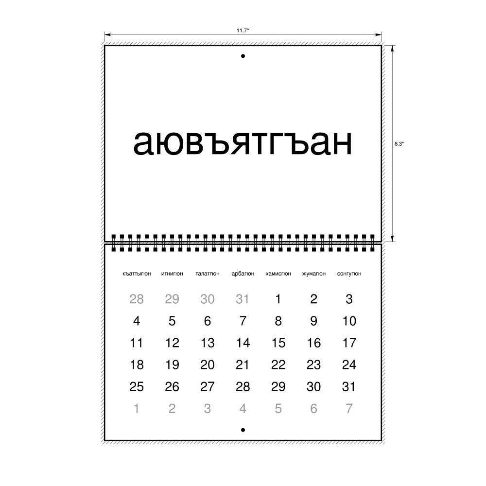 • Linguistics enthusiasts and polyglots - For "language geeks" interested in comparative linguistics or the mechanics of different languages and who value the aesthetic differences in scripts, orthography, and typography of different languages, the Kumyk calendar serves as an object of intellectual interest. You can collect calendars for various languages to compare their linguistic roots (e.g., comparing Romance languages vs. Slavic languages). Leskoff's calendars are characterized by specific typographic choices that highlight the orthography and script unique to the target language. Think correct usage of diacritics, characters, and directional writing (left-to-right vs. right-to-left). The minimalist design focuses on legibility and aesthetic appeal of the script itself.