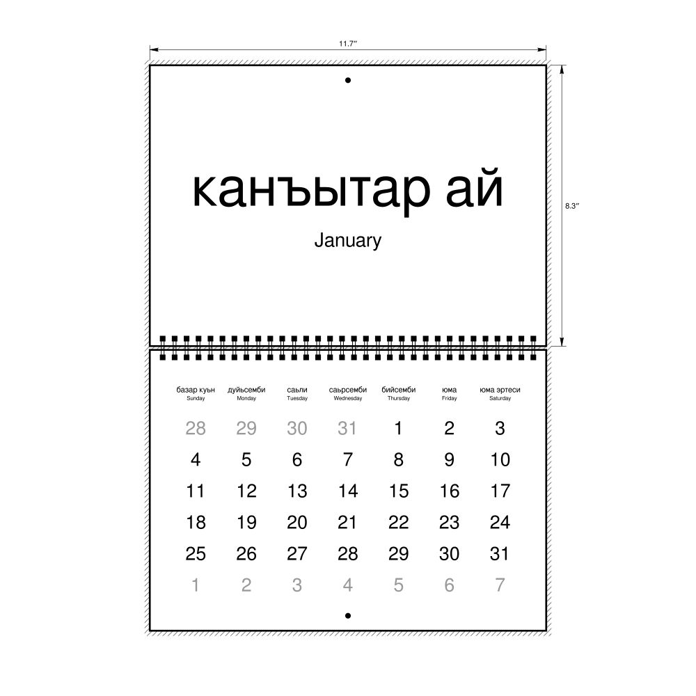2027 Wall Calendar, Nogai/English-Labeled, Monday-Start Layout, Wire-Bound, 11.7 x 8.3 in (29.7 x 21.0 cm)