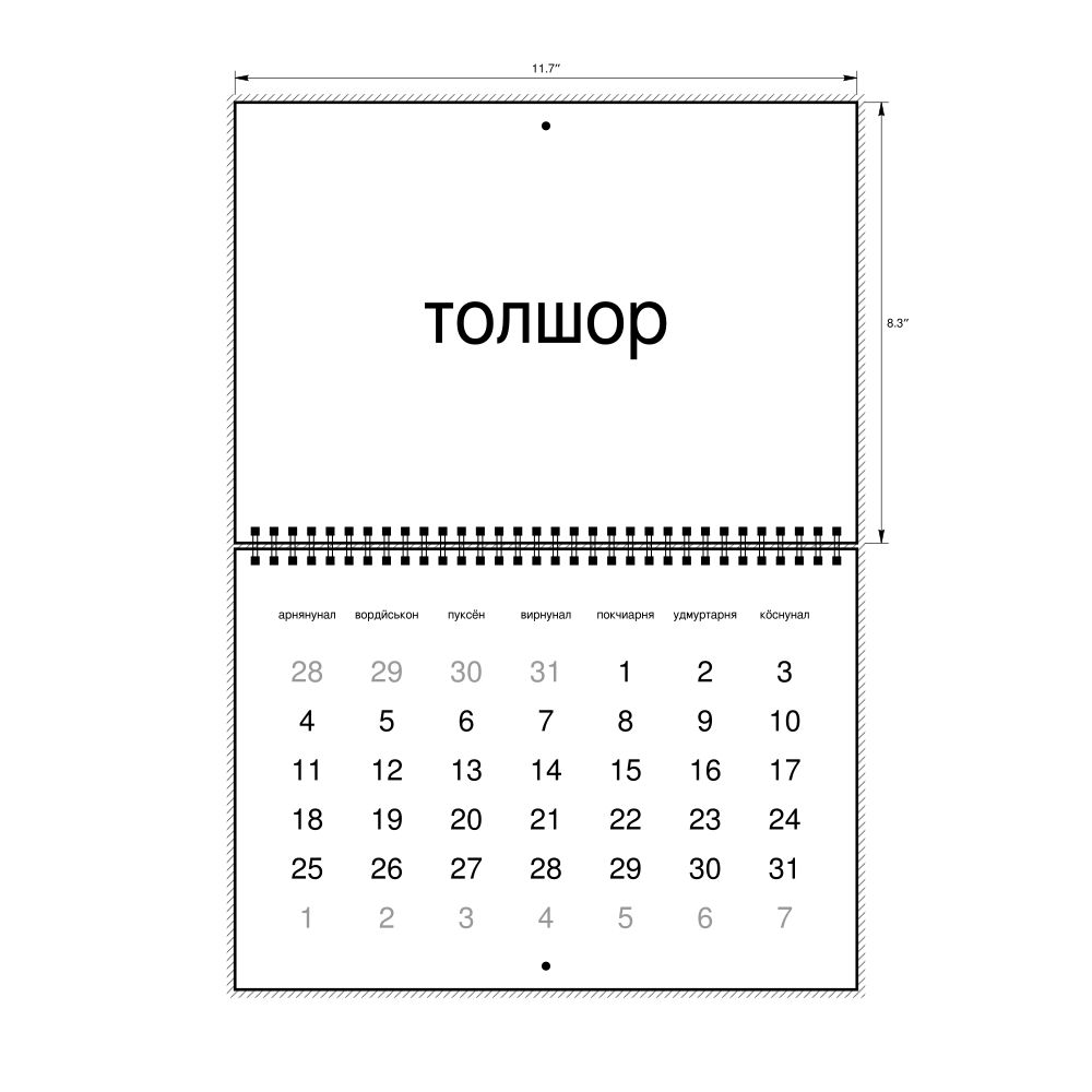 This calendar features the Udmurt names of months and days of the week on top of a standard Gregorian calendar layout. Beyond its utility for tracking dates, it serves as an educational tool, cultural touchstone (cultural artifact), and functional decor (aesthetic object).