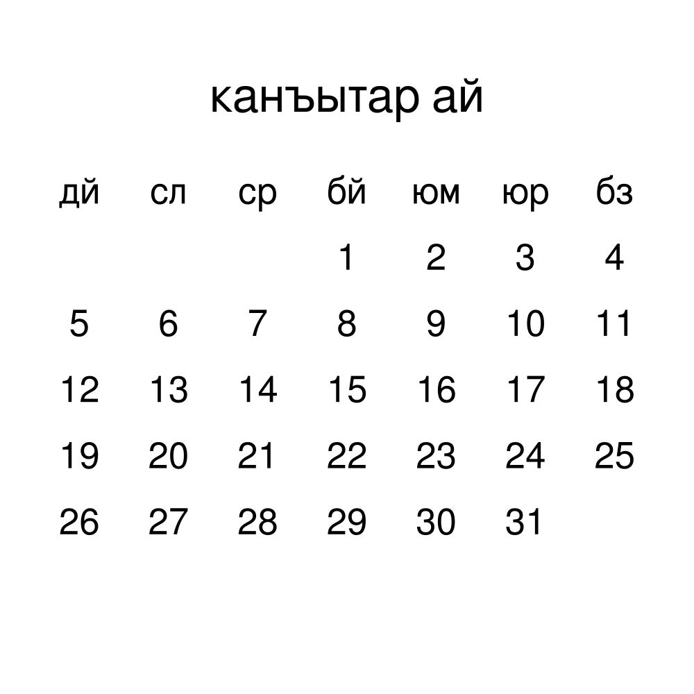 - Nogai heritage speakers and cultural connectors - For individuals seeking to maintain a connection to their history, ancestral roots, or the culture associated with the Nogai language, the calendar serves as a daily cultural marker. Use it in your home, office, library, or museum as a link to linguistic and cultural identity that integrates Nogai into your everyday life. Familiar language script and naming conventions may also provide a sense of home in a foreign environment.