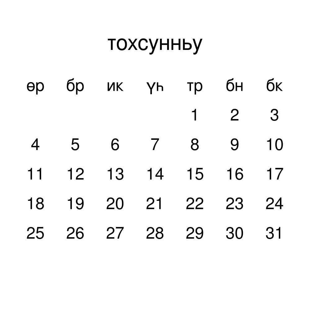• Yakut speakers and enthusiasts - Choose this calendar if you are looking for a simple, localized calendar in the Yakut language. Use it in your home, office, or classroom as a regular calendar.