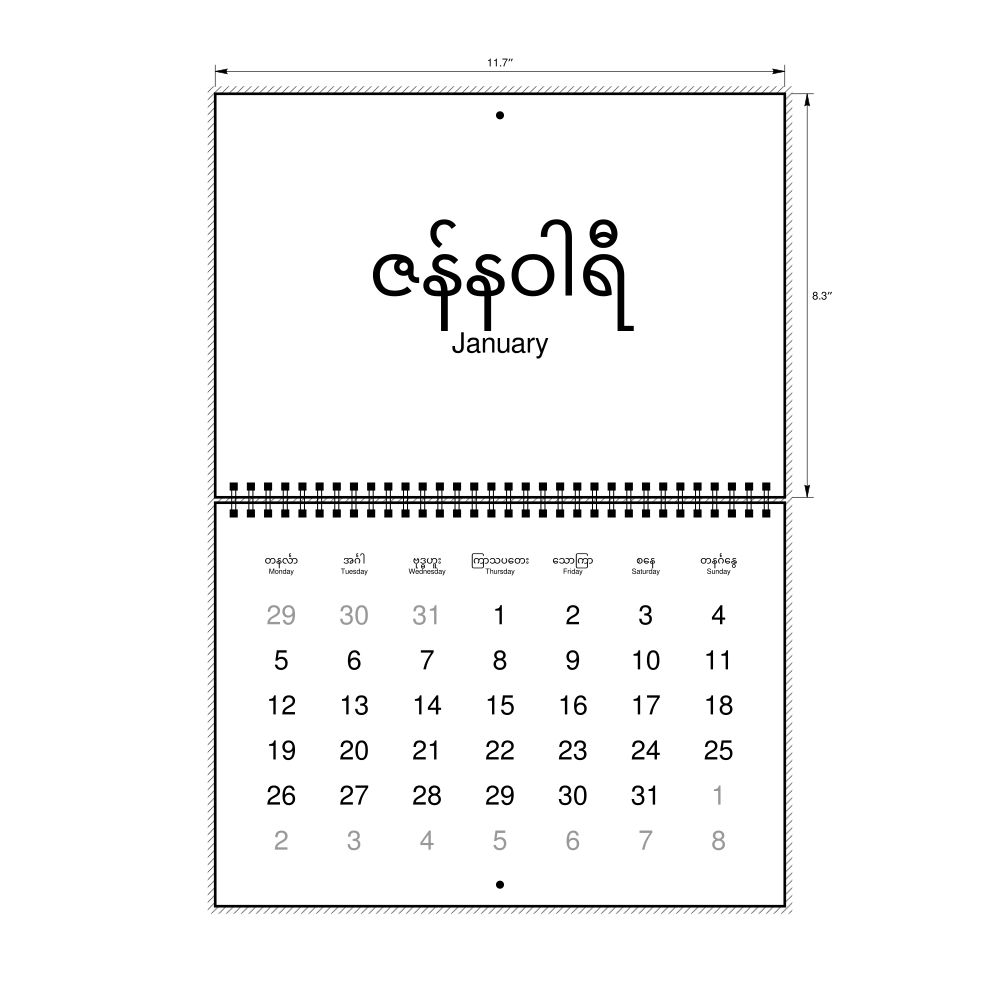 2026 Wall CalendarBurmese/English-Labeled, Monday-Start Layout, Wire-Bound, 11.7 x 8.3 in (29.7 x 21.0 cm)