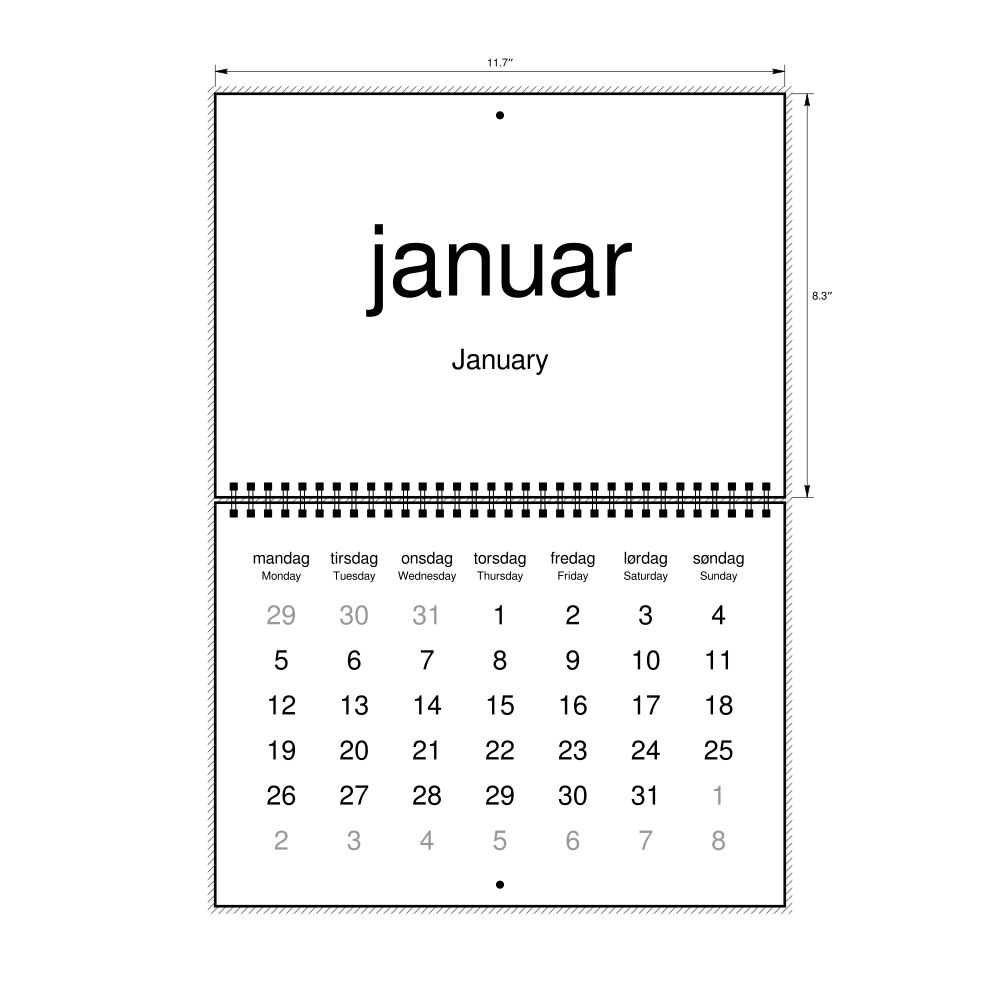 2026 Wall CalendarNorwegian/English-Labeled, Monday-Start Layout, Wire-Bound, 11.7 x 8.3 in (29.7 x 21.0 cm)