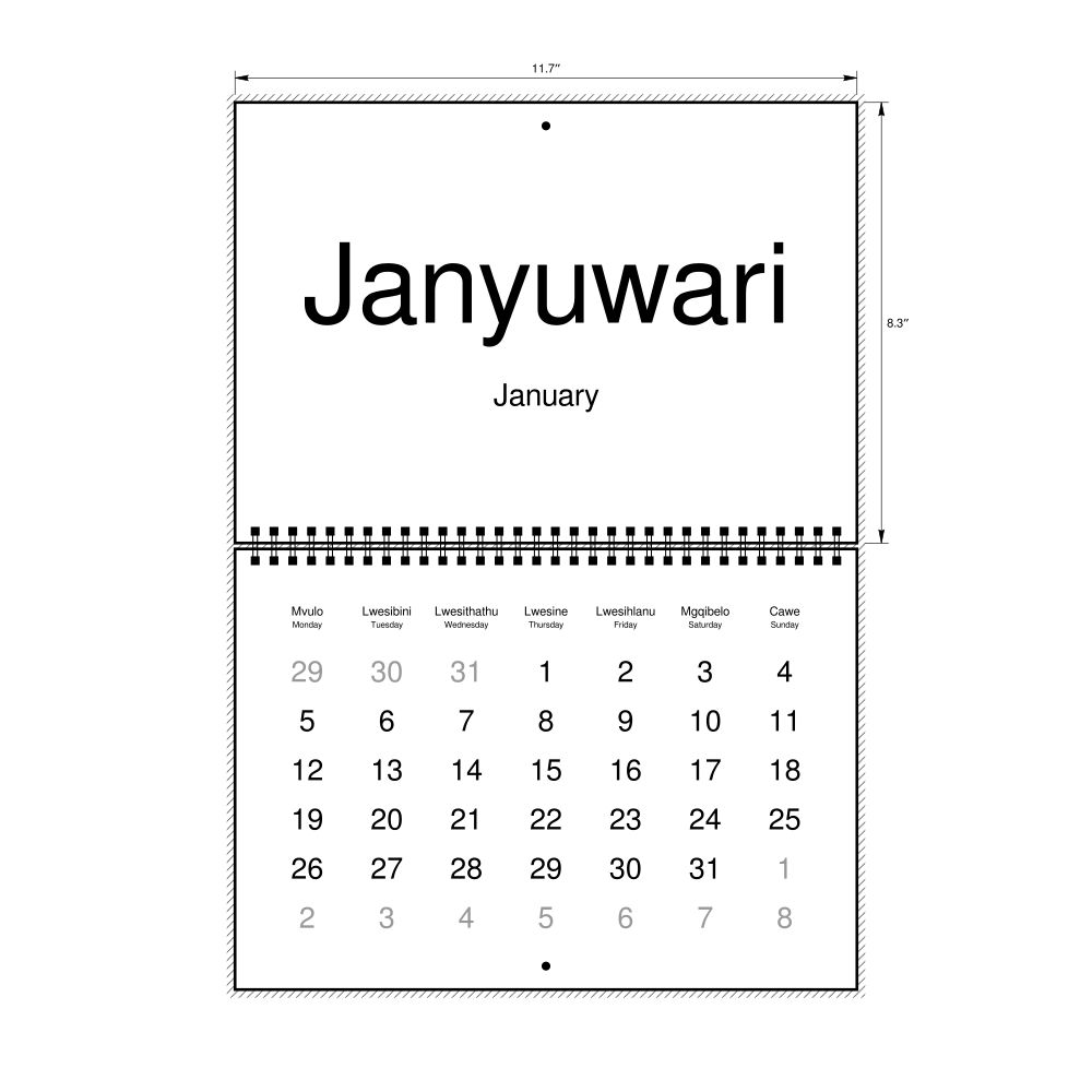 2027 Wall Calendar, Xhosa-Labeled, Monday-Start Layout, Wire-Bound, 11.7 x 8.3 in (29.7 x 21.0 cm)
