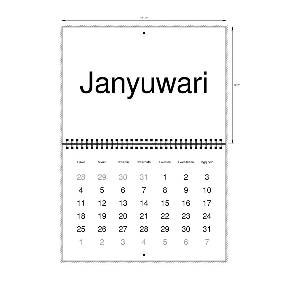 This calendar features the Xhosa names of months and days of the week on top of a standard Gregorian calendar layout. Beyond its utility for tracking dates, it serves as an educational tool, cultural touchstone (cultural artifact), and functional decor (aesthetic object).