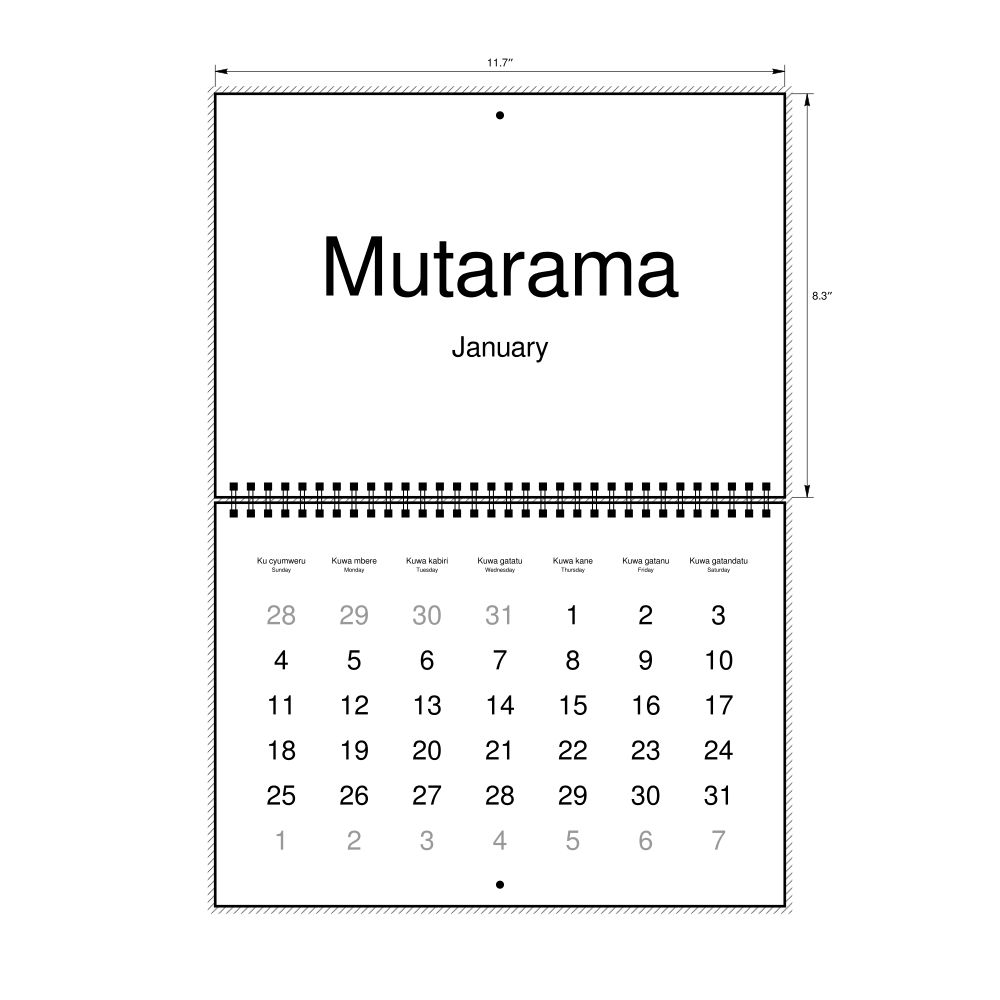 2026 Wall Calendar, Kinyarwanda-Labeled, Sunday-Start Layout, Wire-Bound, 11.7 x 8.3 in (29.7 x 21.0 cm)