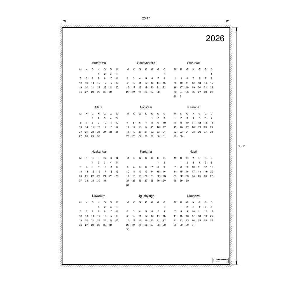 - Kinyarwanda heritage speakers and cultural connectors - For individuals seeking to maintain a connection to their history, ancestral roots, or the culture associated with the Kinyarwanda language, the calendar serves as a daily cultural marker. Use it in your home, office, library, or museum as a link to linguistic and cultural identity that integrates Kinyarwanda into your everyday life. Familiar language script and naming conventions may also provide a sense of home in a foreign environment.