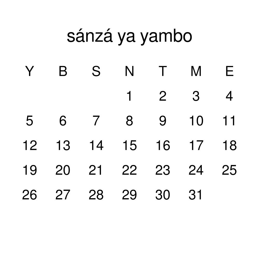 This calendar features the Lingala names of months and days of the week on top of a standard Gregorian calendar layout. Beyond its utility for tracking dates, it serves as an educational tool, cultural touchstone (cultural artifact), and functional decor (aesthetic object).