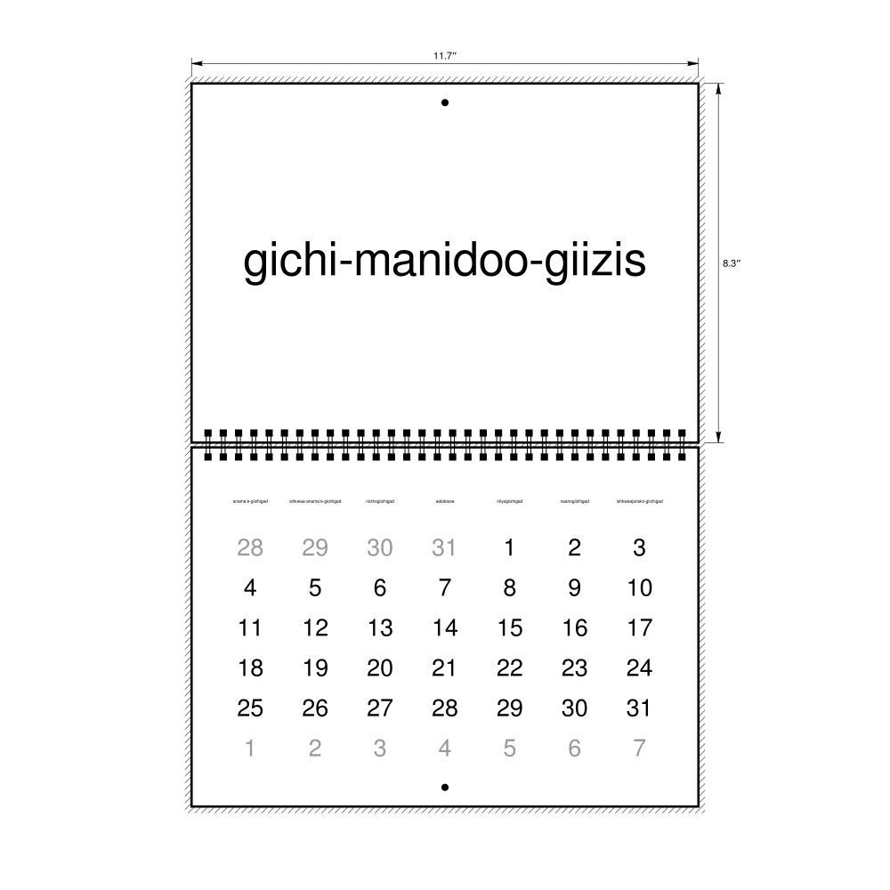 This calendar features the Ojibwe names of months and days of the week on top of a standard Gregorian calendar layout. Beyond its utility for tracking dates, it serves as an educational tool, cultural touchstone (cultural artifact), and functional decor (aesthetic object).