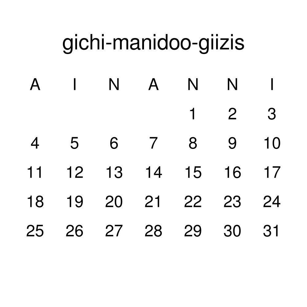 This calendar features the Ojibwe names of months and days of the week on top of a standard Gregorian calendar layout. Beyond its utility for tracking dates, it serves as an educational tool, cultural touchstone (cultural artifact), and functional decor (aesthetic object).