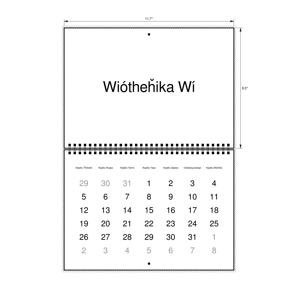 This calendar features the Lakota names of months and days of the week on top of a standard Gregorian calendar layout. Beyond its utility for tracking dates, it serves as an educational tool, cultural touchstone (cultural artifact), and functional decor (aesthetic object).