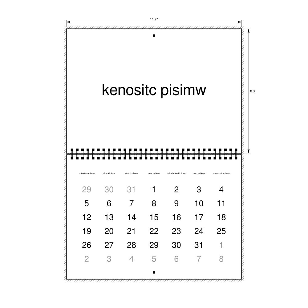 This calendar features the Atikamekw names of months and days of the week on top of a standard Gregorian calendar layout. Beyond its utility for tracking dates, it serves as an educational tool, cultural touchstone (cultural artifact), and functional decor (aesthetic object).