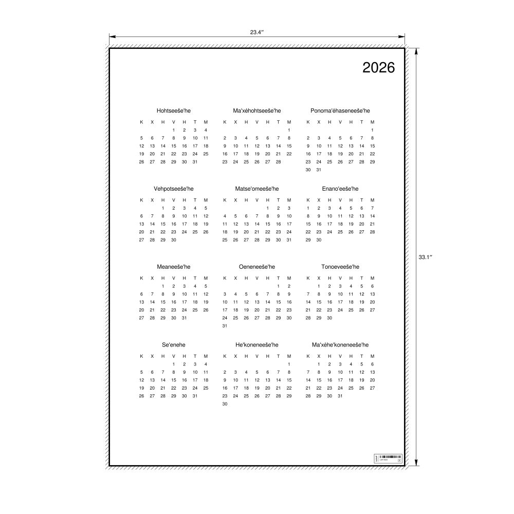 This calendar features the Cheyenne names of months and days of the week on top of a standard Gregorian calendar layout. Beyond its utility for tracking dates, it serves as an educational tool, cultural touchstone (cultural artifact), and functional decor (aesthetic object).