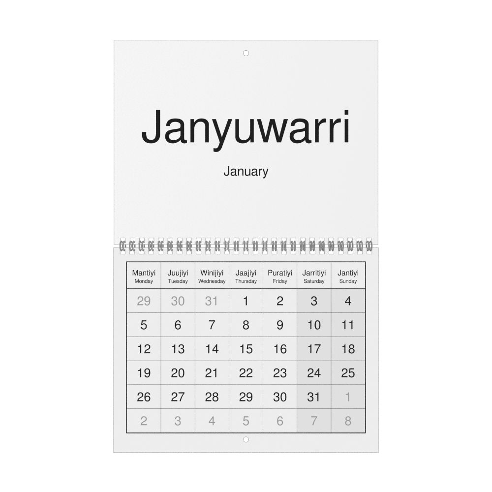 2026 Wall Calendar, Warlpiri/English-Labeled, Sunday-Start Layout, Wire-Bound, 11 x 8.5 in (27.9 x 21.6 cm)