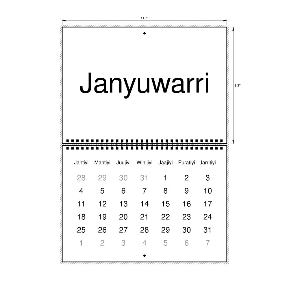 • Warlpiri heritage speakers and cultural connectors - For individuals seeking to maintain a connection to their history, ancestral roots, or the culture associated with the Warlpiri language, the calendar serves as a daily cultural marker. Use it in your home, office, library, or museum as a link to linguistic and cultural identity that integrates Warlpiri into your everyday life. Familiar language script and naming conventions may also provide a sense of home in a foreign environment.