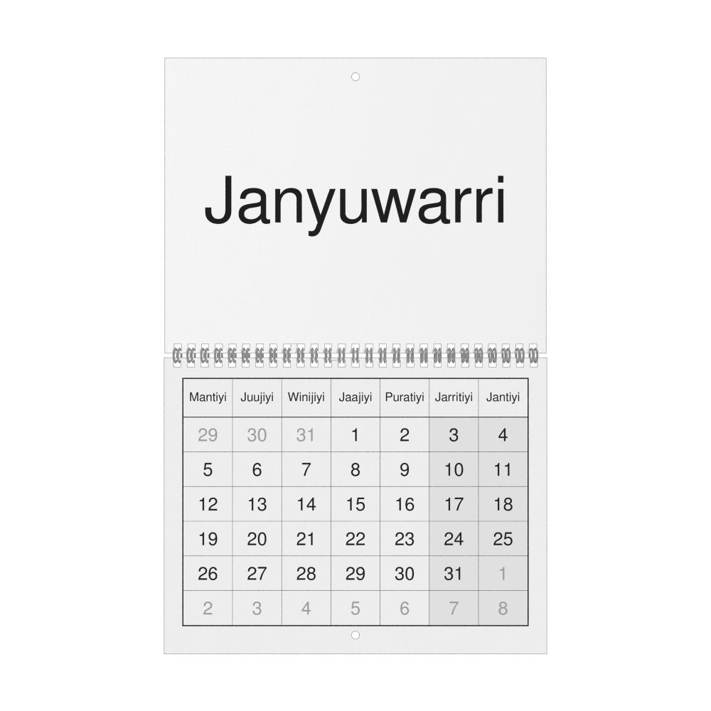 - Warlpiri heritage speakers and cultural connectors - For individuals seeking to maintain a connection to their history, ancestral roots, or the culture associated with the Warlpiri language, the calendar serves as a daily cultural marker. Use it in your home, office, library, or museum as a link to linguistic and cultural identity that integrates Warlpiri into your everyday life. Familiar language script and naming conventions may also provide a sense of home in a foreign environment.