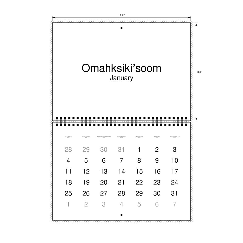 A Blackfoot-language wall calendar (2026, Sunday-start format) with English translations.