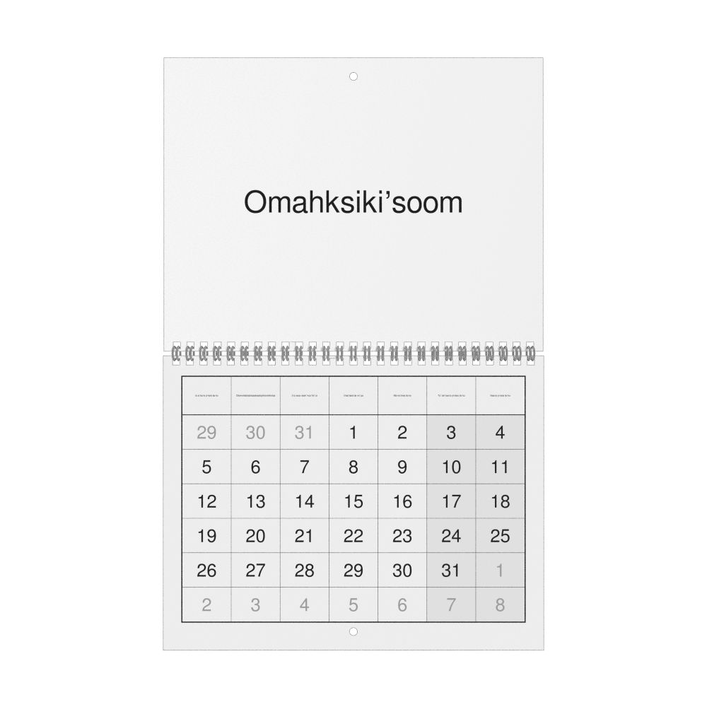This calendar features the Blackfoot names of months and days of the week on top of a standard Gregorian calendar layout. Beyond its utility for tracking dates, it serves as an educational tool, cultural touchstone (cultural artifact), and functional decor (aesthetic object).
