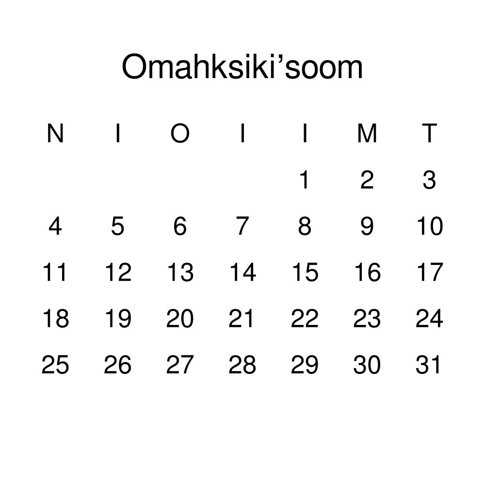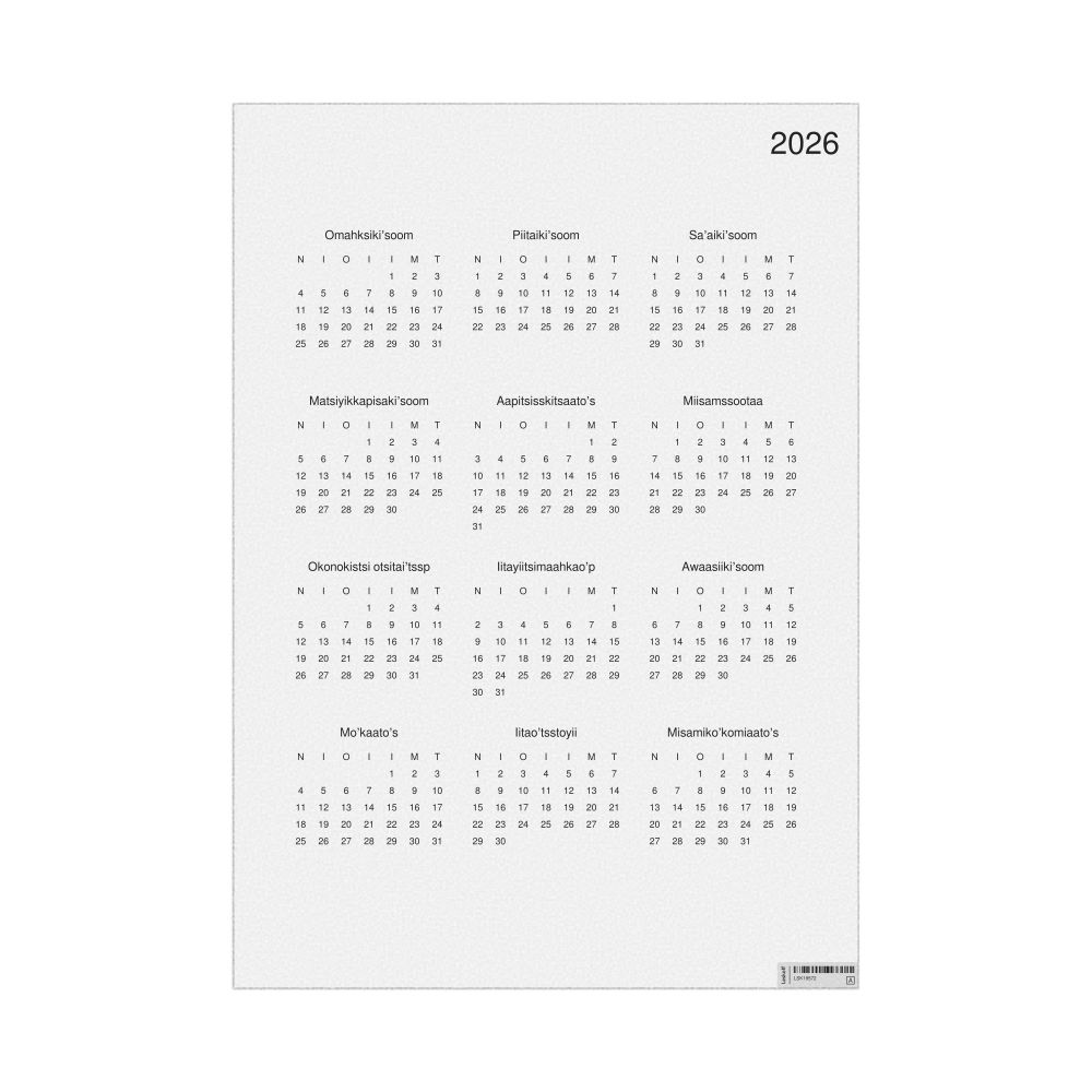This calendar features the Blackfoot names of months and days of the week on top of a standard Gregorian calendar layout. Beyond its utility for tracking dates, it serves as an educational tool, cultural touchstone (cultural artifact), and functional decor (aesthetic object).