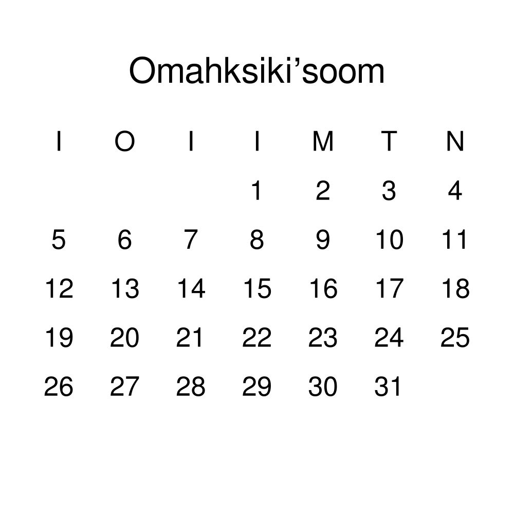 • Blackfoot heritage speakers and cultural connectors - For individuals seeking to maintain a connection to their history, ancestral roots, or the culture associated with the Blackfoot language, the calendar serves as a daily cultural marker. Use it in your home, office, library, or museum as a link to linguistic and cultural identity that integrates Blackfoot into your everyday life. Familiar language script and naming conventions may also provide a sense of home in a foreign environment.