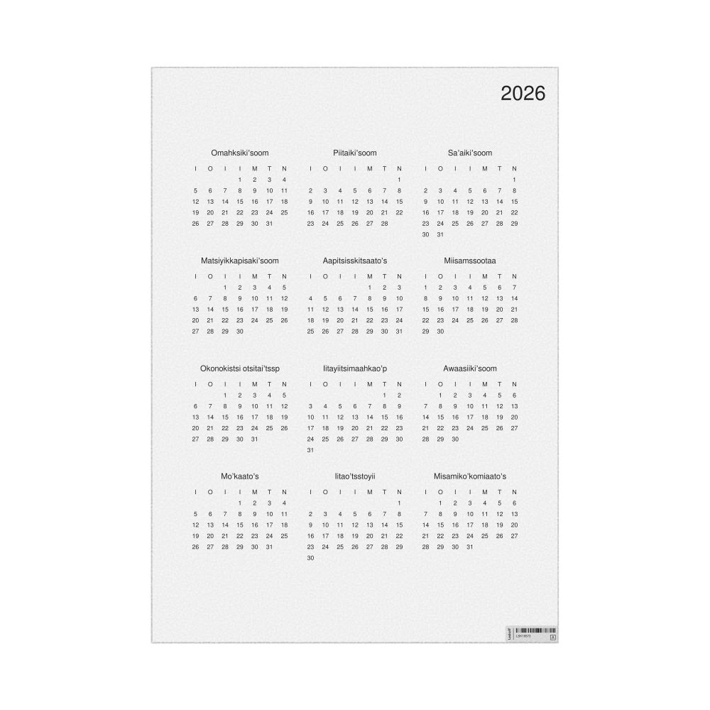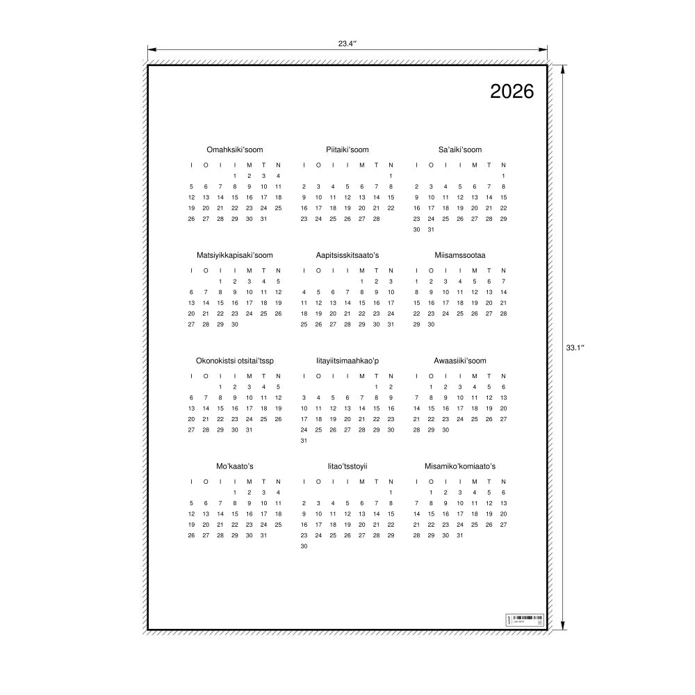 This calendar features the Blackfoot names of months and days of the week on top of a standard Gregorian calendar layout. Beyond its utility for tracking dates, it serves as an educational tool, cultural touchstone (cultural artifact), and functional decor (aesthetic object).