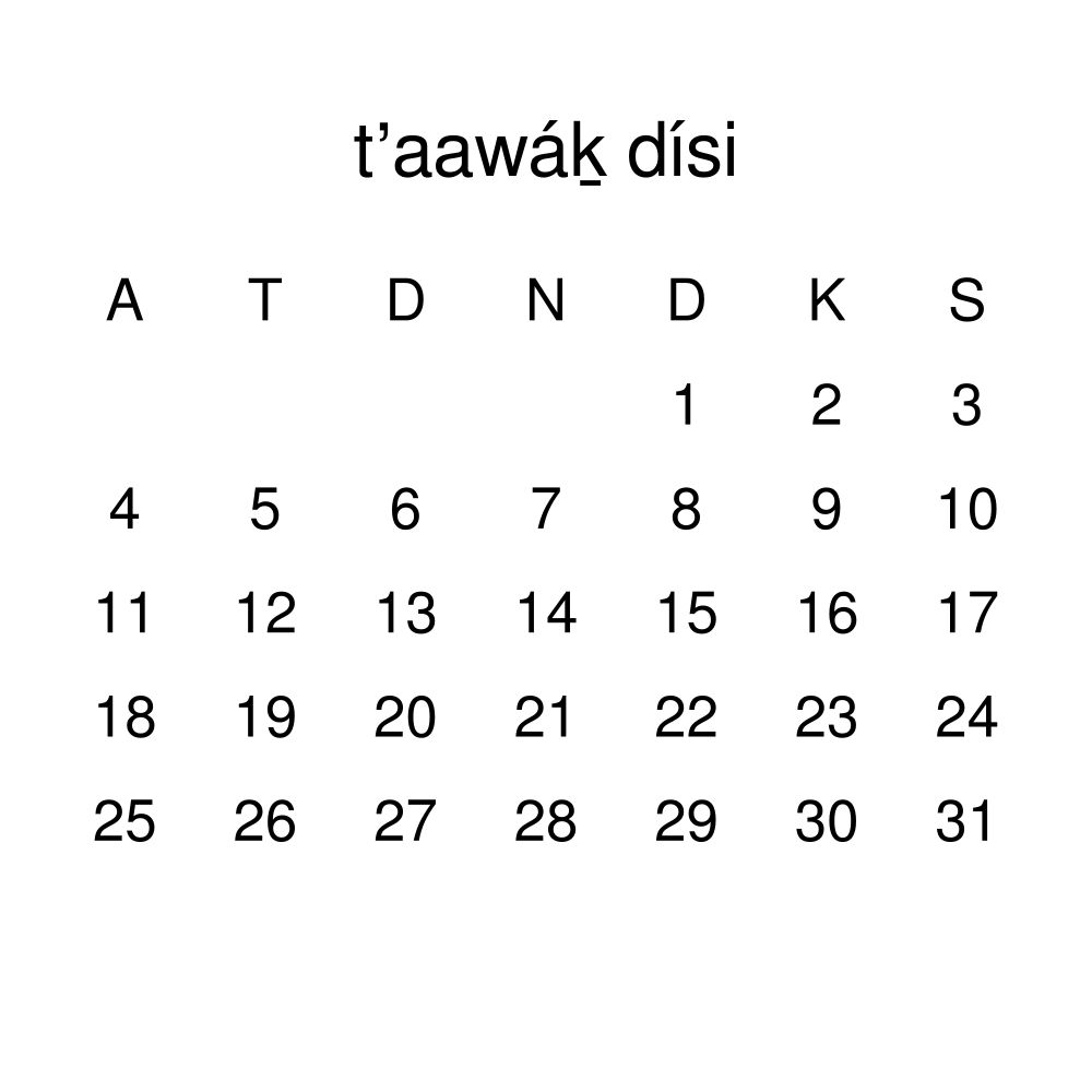 - Tlingit speakers and enthusiasts - Choose this calendar if you are looking for a simple, localized calendar in the Tlingit language. Use it in your home, office, or classroom as a regular calendar.
