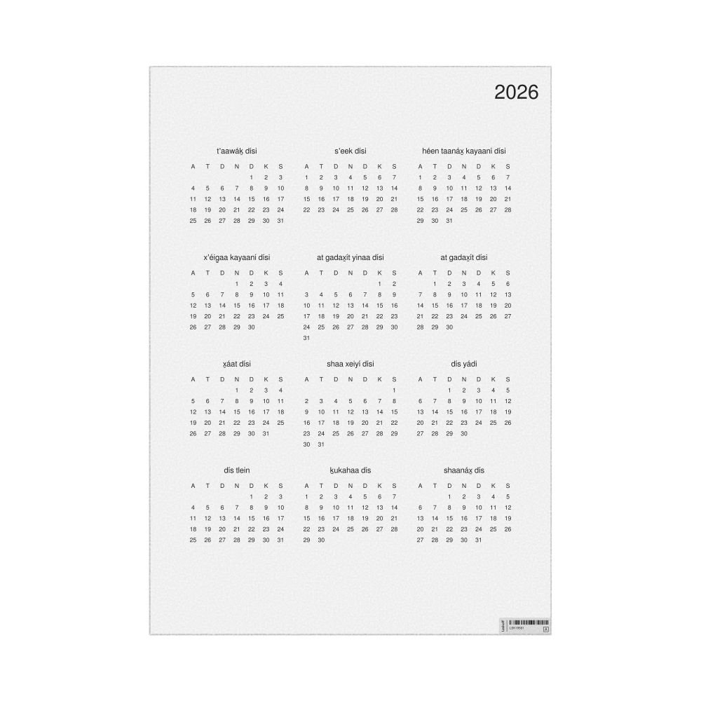 A 2026 wall calendar in Tlingit. The calendar uses the Sunday-start week format (common in the US and Canada).