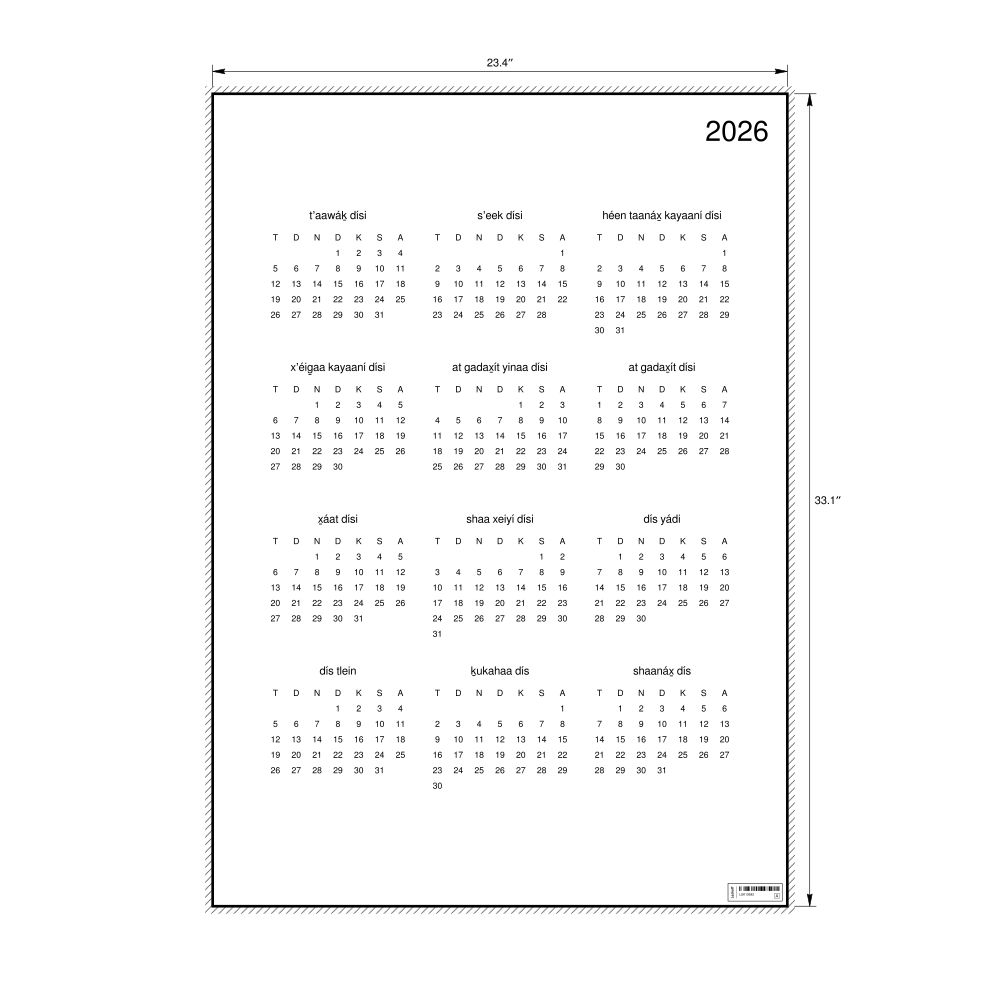 This calendar features the Tlingit names of months and days of the week on top of a standard Gregorian calendar layout. Beyond its utility for tracking dates, it serves as an educational tool, cultural touchstone (cultural artifact), and functional decor (aesthetic object).