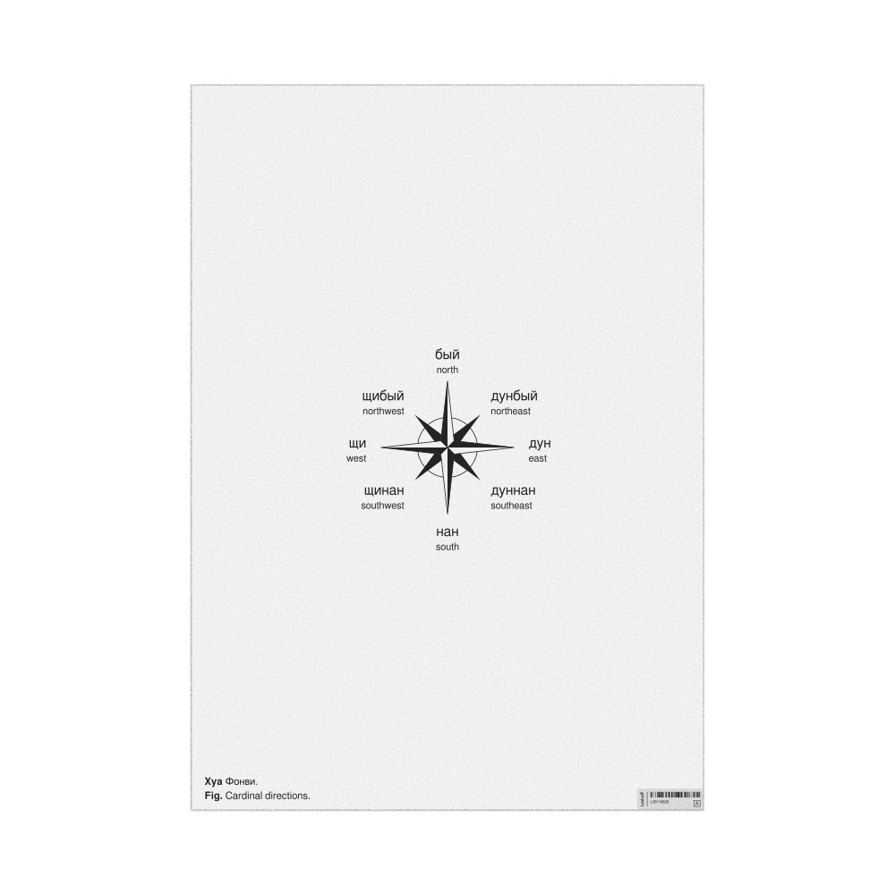 A poster of the cardinal directions (also known as compass points) in Dungan (Фонви) with English translations.