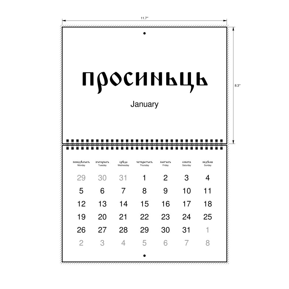 - Polyglots and autodidacts - For "language geeks" interested in the origins of different languages, classical literature, and scholarly pursuits and who value the typographic and aesthetic details of historical languages, the Old Church Slavonic calendar serves as an object of intellectual interest. You can collect calendars for various languages to compare their linguistic roots. The minimalist design focuses on legibility and aesthetic appeal of the historic and reconstructed words themselves.