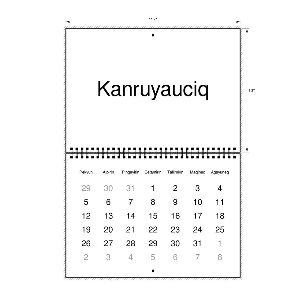 - Yup'ik heritage speakers and cultural connectors - For individuals seeking to maintain a connection to their history, ancestral roots, or the culture associated with the Yup'ik language, the calendar serves as a daily cultural marker. Use it in your home, office, library, or museum as a link to linguistic and cultural identity that integrates Yup'ik into your everyday life. Familiar language script and naming conventions may also provide a sense of home in a foreign environment.