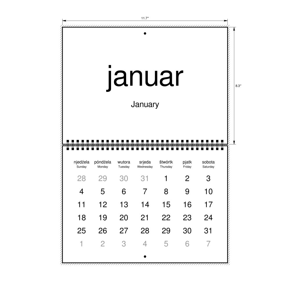 2026 Wall CalendarUpper Sorbian/English-Labeled, Sunday-Start Layout, Wire-Bound, 11.7 x 8.3 in (29.7 x 21.0 cm)
