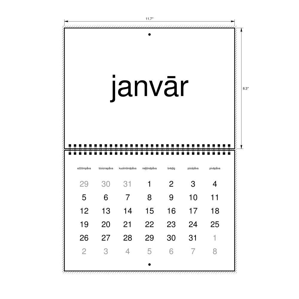 - Linguistics enthusiasts and polyglots - For "language geeks" interested in comparative linguistics or the mechanics of different languages and who value the aesthetic differences in scripts, orthography, and typography of different languages, the Livonian calendar serves as an object of intellectual interest. You can collect calendars for various languages to compare their linguistic roots (e.g., comparing Romance languages vs. Slavic languages). Leskoff's calendars are characterized by specific typographic choices that highlight the orthography and script unique to the target language. Think correct usage of diacritics, characters, and directional writing (left-to-right vs. right-to-left). The minimalist design focuses on legibility and aesthetic appeal of the script itself.