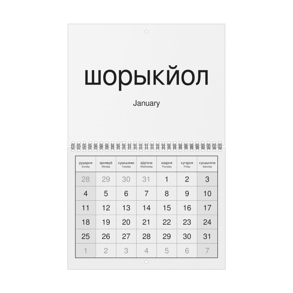 A Meadow Mari-language wall calendar (2026, Sunday-start format) with English translations.