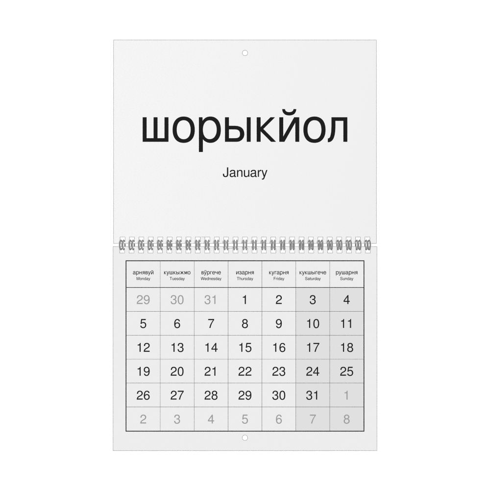 A Meadow Mari-language wall calendar (2026, Monday-start format) with English translations.
