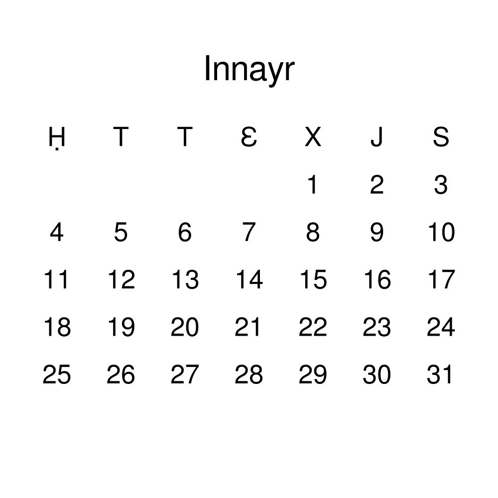 This calendar features the Tashelhit names of months and days of the week on top of a standard Gregorian calendar layout. Beyond its utility for tracking dates, it serves as an educational tool, cultural touchstone (cultural artifact), and functional decor (aesthetic object).