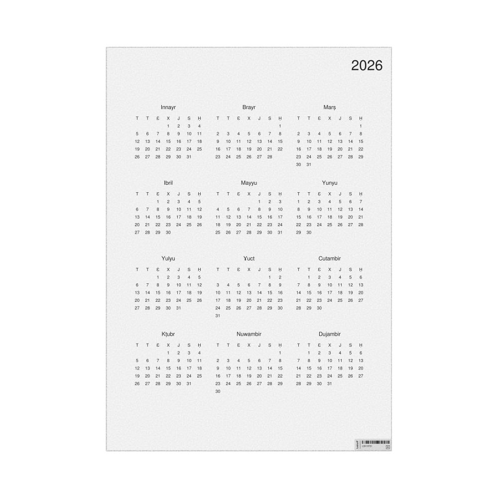 A 2026 wall calendar in Tashelhit. The calendar uses the Monday-start week format (common in the UK and Europe).