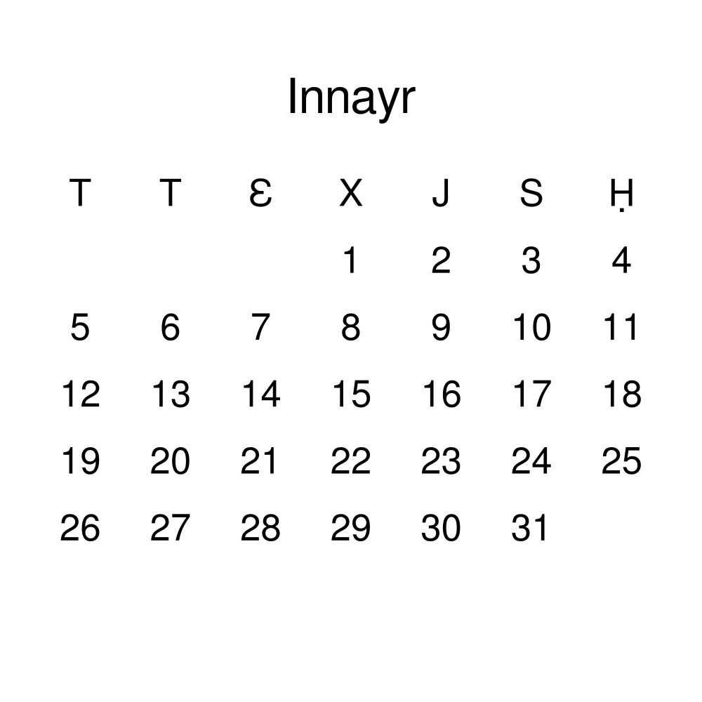 This calendar features the Tashelhit names of months and days of the week on top of a standard Gregorian calendar layout. Beyond its utility for tracking dates, it serves as an educational tool, cultural touchstone (cultural artifact), and functional decor (aesthetic object).