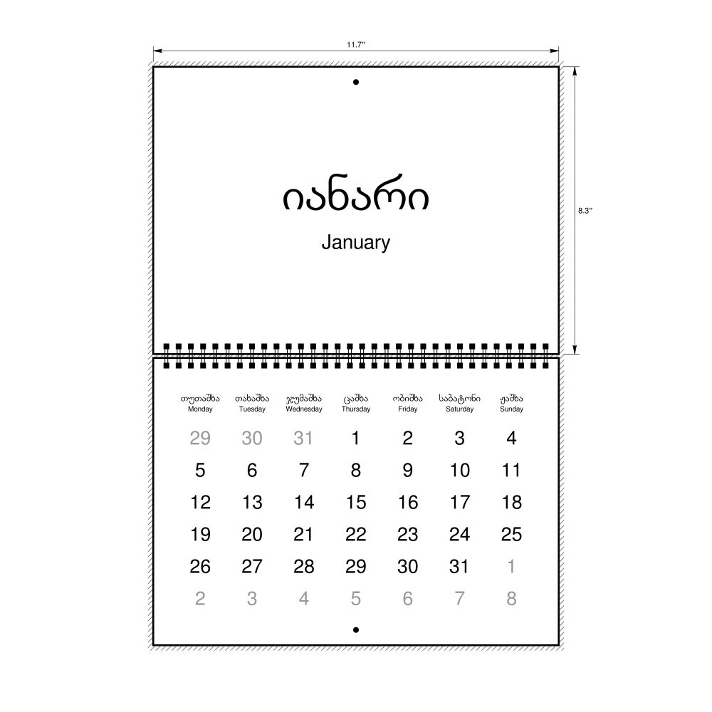 2026 Wall CalendarMingrelian/English-Labeled, Monday-Start Layout, Wire-Bound, 11.7 x 8.3 in (29.7 x 21.0 cm)