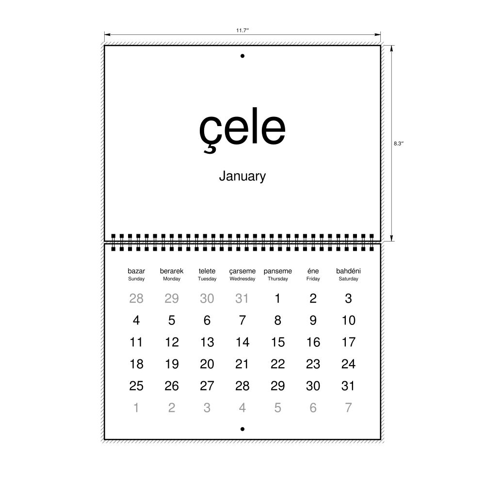 2026 Wall Calendar, Zaza/English-Labeled, Monday-Start Layout, Wire-Bound, 11.7 x 8.3 in (29.7 x 21.0 cm)