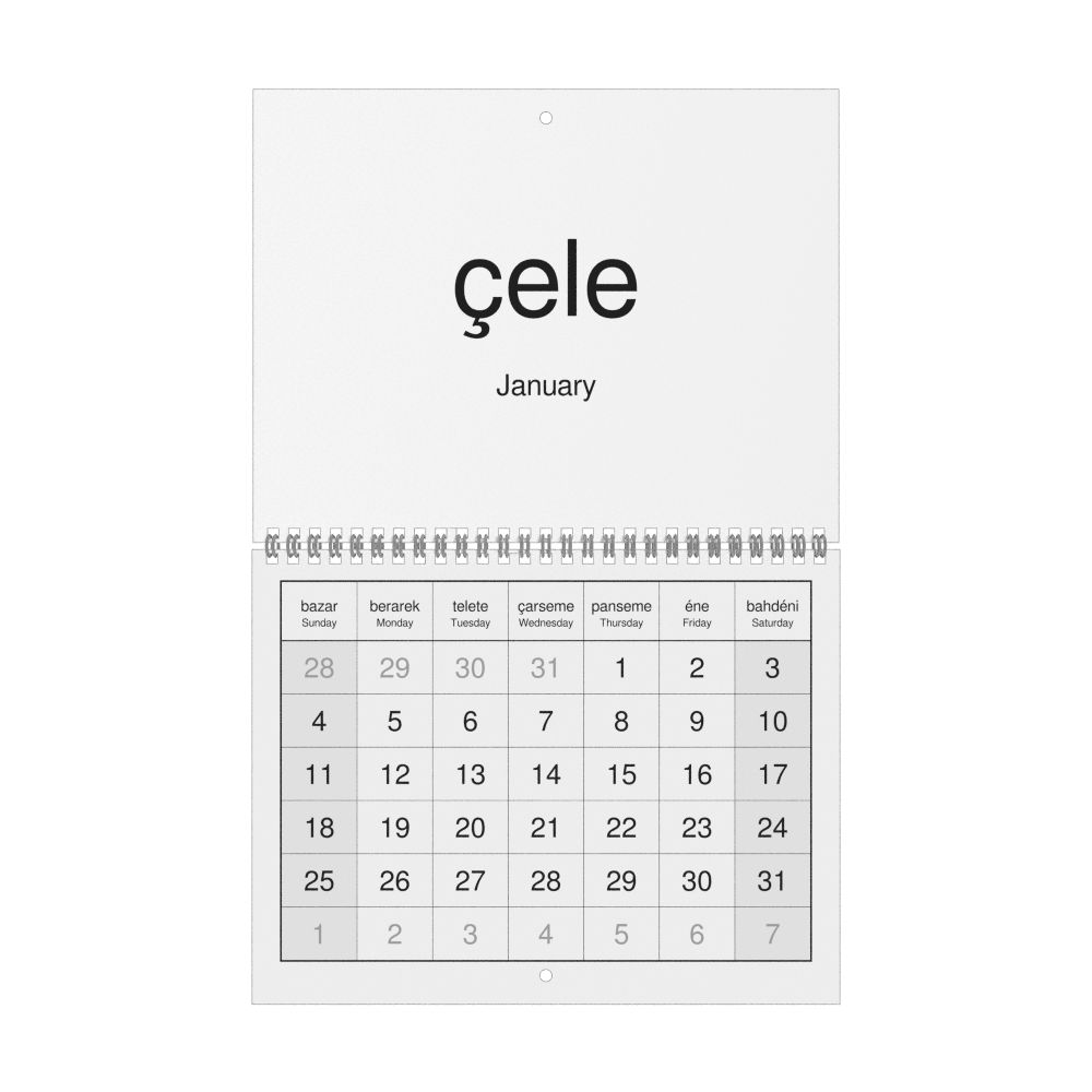 A Zaza-language wall calendar (2026, Sunday-start format) with English translations.