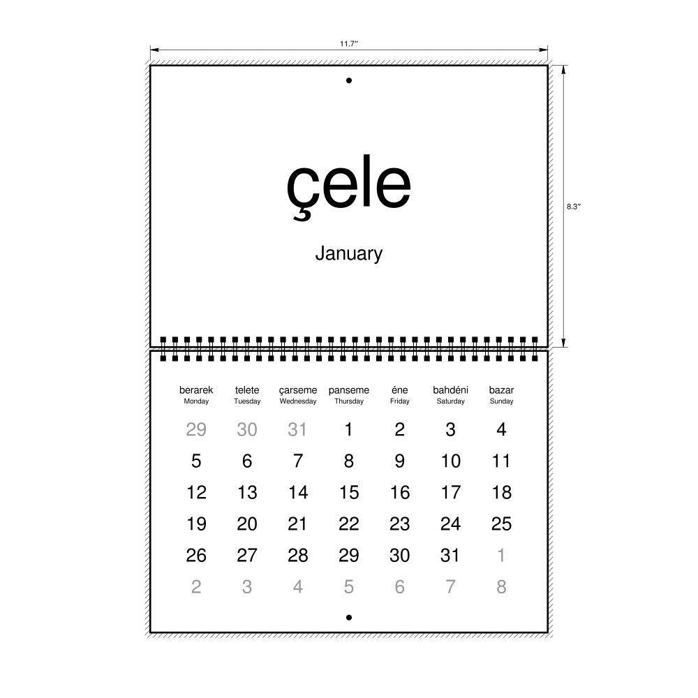A Zaza-language wall calendar (2026, Monday-start format) with English translations.