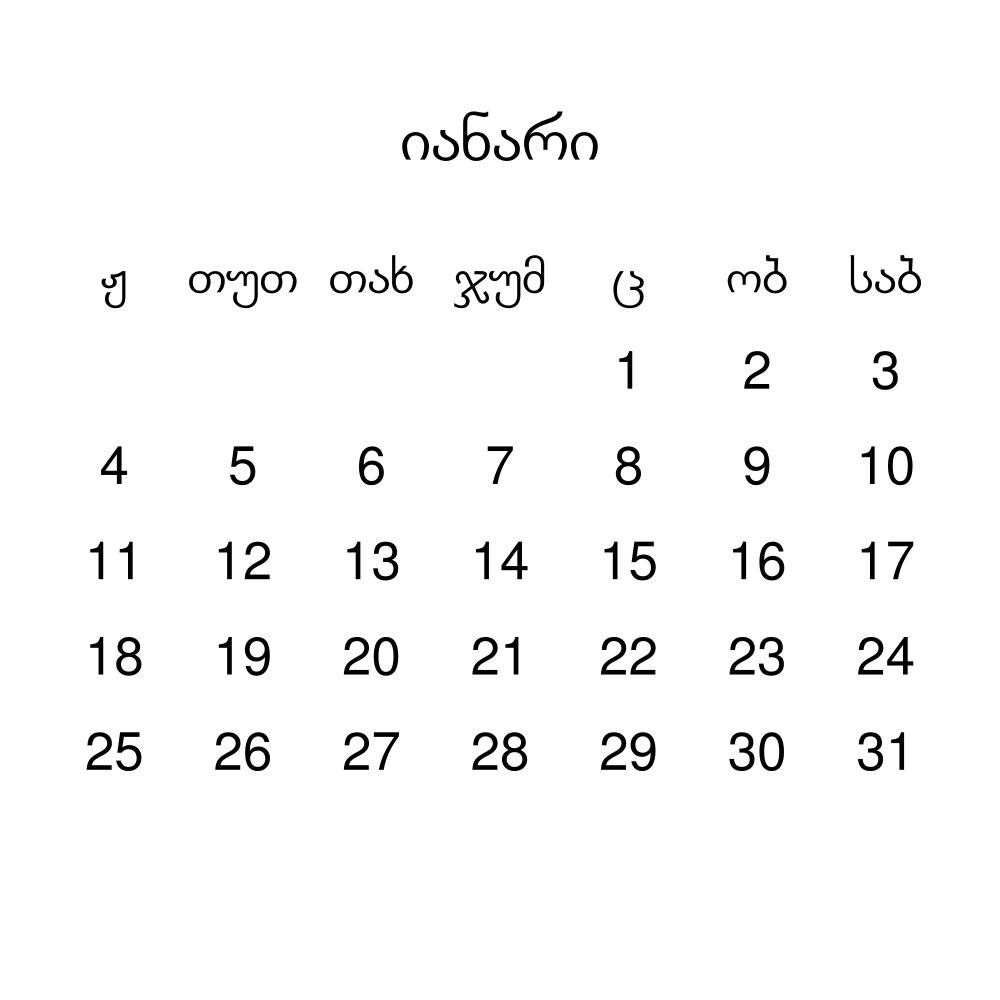 • Mingrelian heritage speakers and cultural connectors - For individuals seeking to maintain a connection to their history, ancestral roots, or the culture associated with the Mingrelian language, the calendar serves as a daily cultural marker. Use it in your home, office, library, or museum as a link to linguistic and cultural identity that integrates Mingrelian into your everyday life. Familiar language script and naming conventions may also provide a sense of home in a foreign environment.